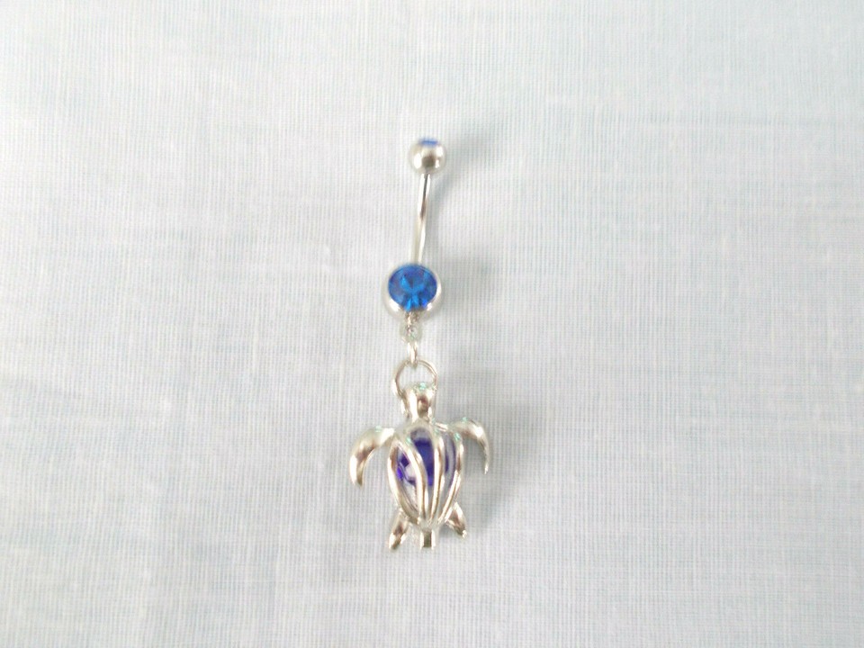 ALOHA HONU SEA TURTLE w CAGED DEEP BLUE CRYSTAL CHARM BLUE CZ 14g BELLY RING