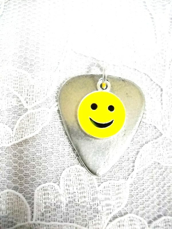 PEWTER GUITAR PICK WITH A SILVER TONE CLASSIC HAPPY FACE - HAVE A NICE DAY (YELLOW BLACK INLAY) CHARM - DOUBLE PENDANT