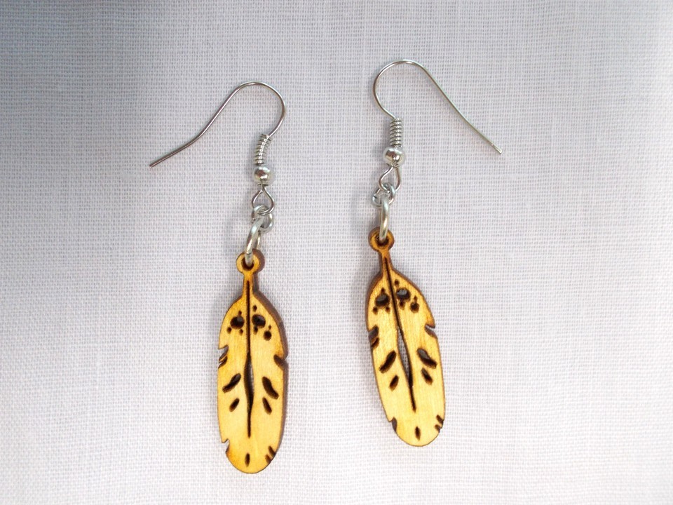 SOUTHWESTERN BIRD FEATHER WIND SPIRIT LASER CUT DANGLING WOOD CHARMS EARRINGS
