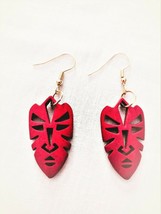 TIKI MASK FACE RED BURGUNDY COLOR CARVED WOODEN DANGLE PAIR OF EARRINGS