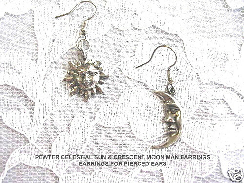 CELESTIAL FLAMING SUN & MAN IN MOON CRESCENT CAST USA PEWTER DANGLE EARRINGS