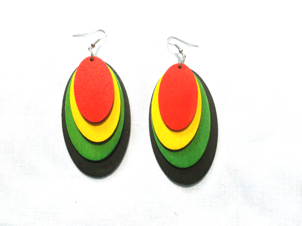 LARGE SIZE - REAL WOOD - 4 TIER - RED - YELLOW - GREEN - BLACK DOUBLE SIDED COLORS - OVAL SHAPE RASTA COLOR WOODEN EARRINGS
