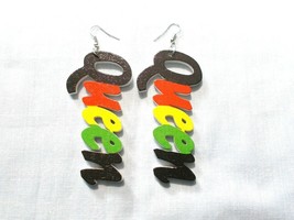 QUEEN TEXT RASTA COLORS RED YELLOW GREEN BLACK WOODEN EARRINGS 3 3/4" DROP