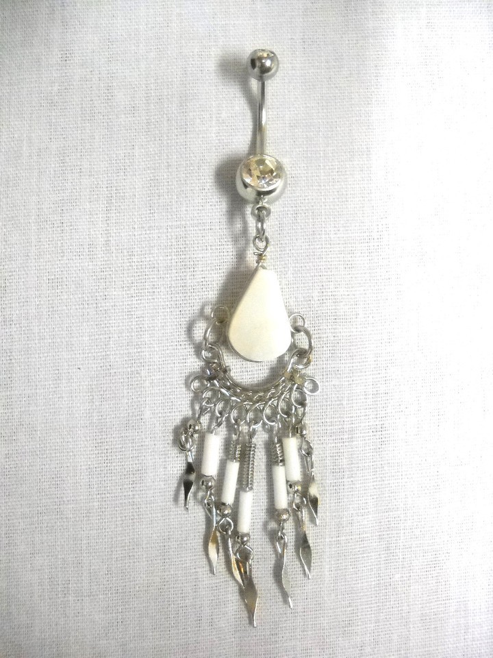 WHITE AGATE STONE DROPLET w DANGLING BEADED TASSELS ON CLEAR 14g BELLY RING BAR