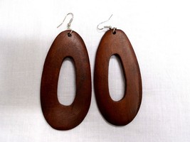 1 PAIR LARGE SIZE REAL WOOD RICH DEEP DARK BROWN COLOR HAND STAINED OVAL GEOMETRIC SHAPED PEEK A BOO DANGLING EARRINGS