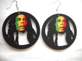 BIG BOB MARLEY FACE ROUND CUT OUT HOOP w RASTA RED YELLOW & GREEN WOOD EARRINGS