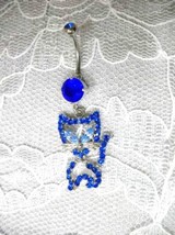 14 guage surgical stainless steel belly barbell with a FABULOUS KITTY CAT full of deep cobalt blue baby blue crystal gems marquis shaped eyes on a BLUE CZ banana bar