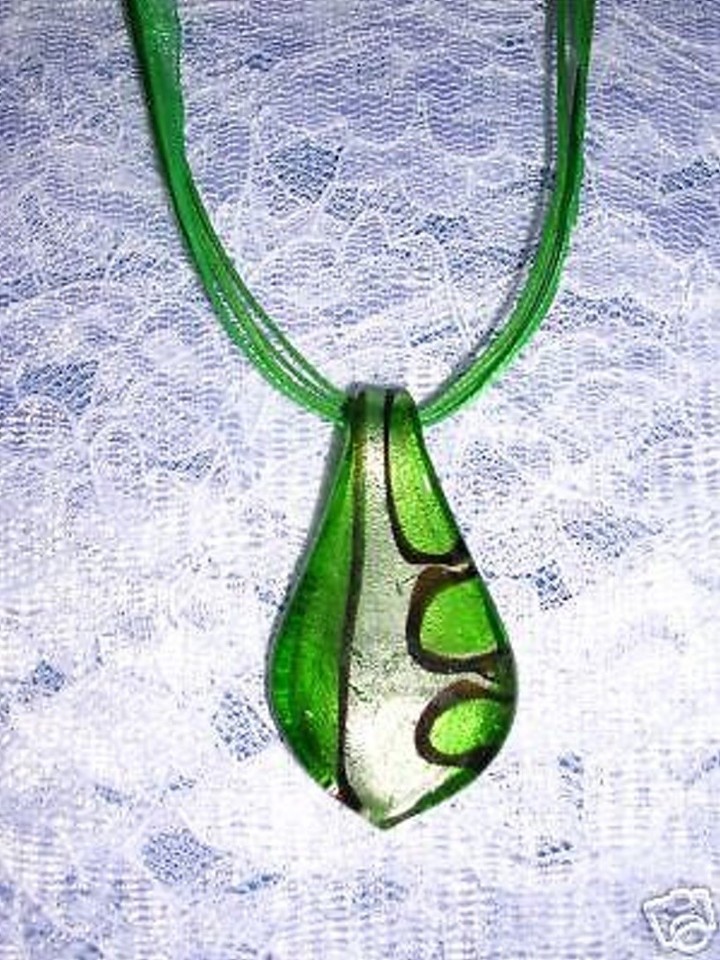 NEW ART DECO SILVER - GREEN - BLACK GLASS TEAR DROP PENDANT GREEN CORD NECKLACE