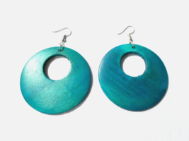 LARGE SIZE REAL WOOD HOT TEAL TURQUOISE BLUE TROPICAL COLOR HAND STAINED CIRCLE ROUNDS WITH A PEEK-A-BOO HOLE IN THE CENTER DANGLING EARRINGS - NOT TOO HEAVY....LIGHTWEIGHT