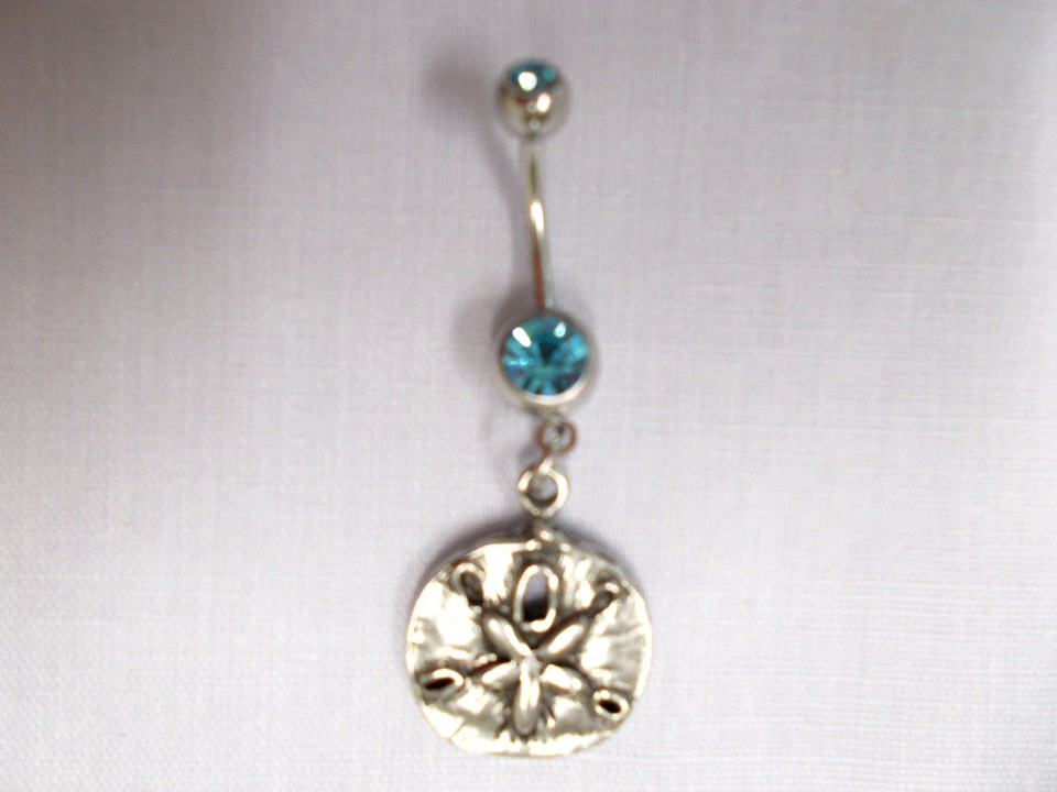 NEW 2 SIDED BEACH SAND DOLLAR PEWTER PENDANT on 14g TURQUOISE BLUE CZ BELLY RING