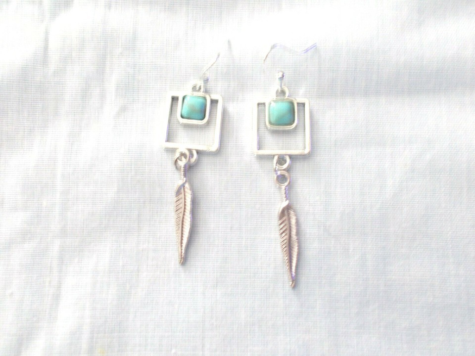 Square Topper & Turquoise Look Gem with Dangling Feather Silver Alloy Earrings