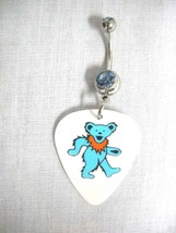 14 gauge surgical stainless steel navel ring belly bar with a WHITE GUITAR PICK GRATEFUL DEAD BABY BLUE ORANGE DANCING BEAR (FRONT) ON A DOUBLE DAZZLING BABY BLUE CZ banana bar BACK SIDE HAS TEXT GRATEFUL DEAD (WHITE) OFFICIAL JIM DUNLOP MED GAUGE DEAD HEAD MERCHANDISE