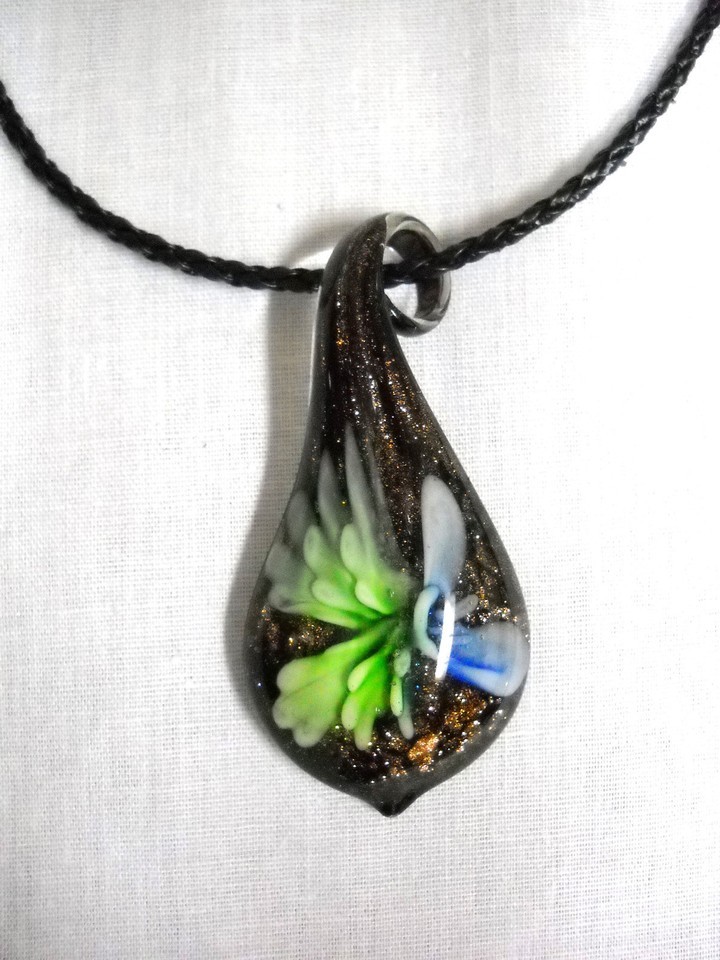 NEW BLACK with BRONZE SHIMMER GREEN LEAVES PRETTY BLUE FLOWER pendant (Sorry about light glare in photo)