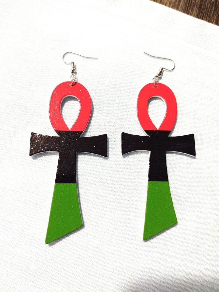 Eternal ANKH Painted Red Black and Green Ethnic Colors Wooden 3 1/2" Earrings