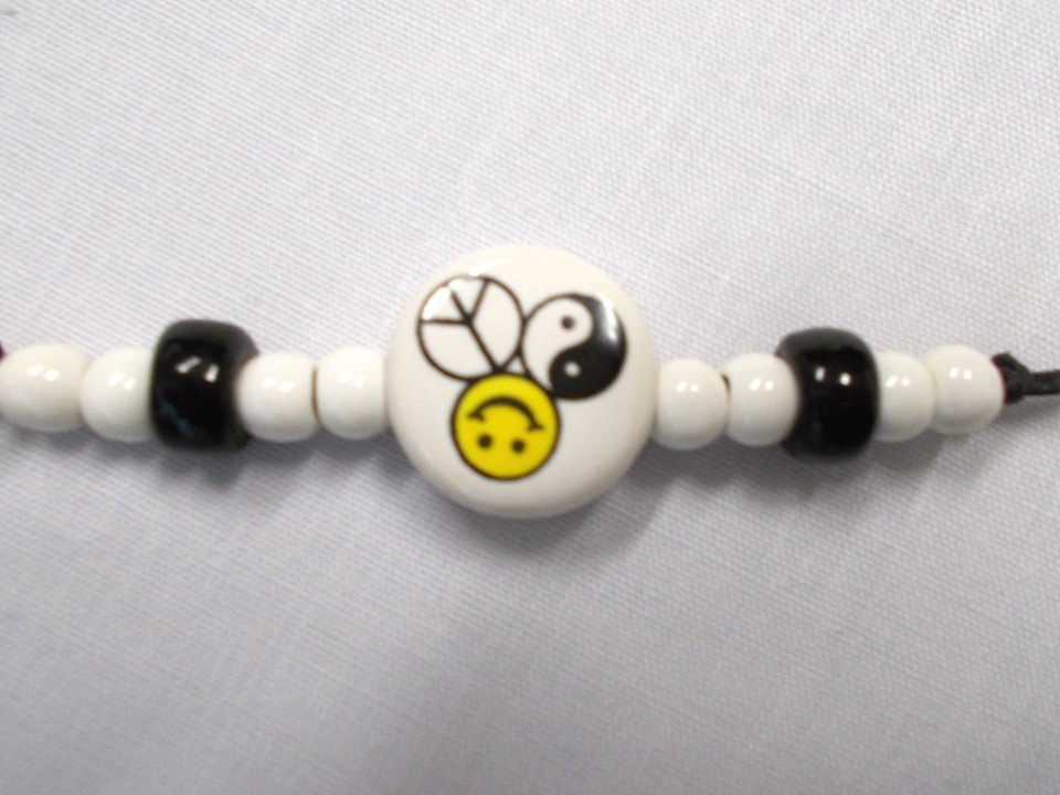 It is made of PERUVIAN CERAMIC HIGH FIRE BEADS - PEACE SIGN - HAPPY FACE - YIN YANG SYMBOL ROUND DISC with BLACK WHITE BEAD ACCENTS