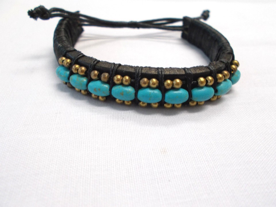 TURQUOISE GEMS & BRASS BEADS CORD WRAPPED LEATHER ADJ SLIDE BRACELET 6 - 11 INCH