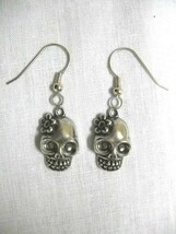 HANDMADE PEWTER SUGAR SKULL with FLOWER CHARMS PAIR OF EARRINGS