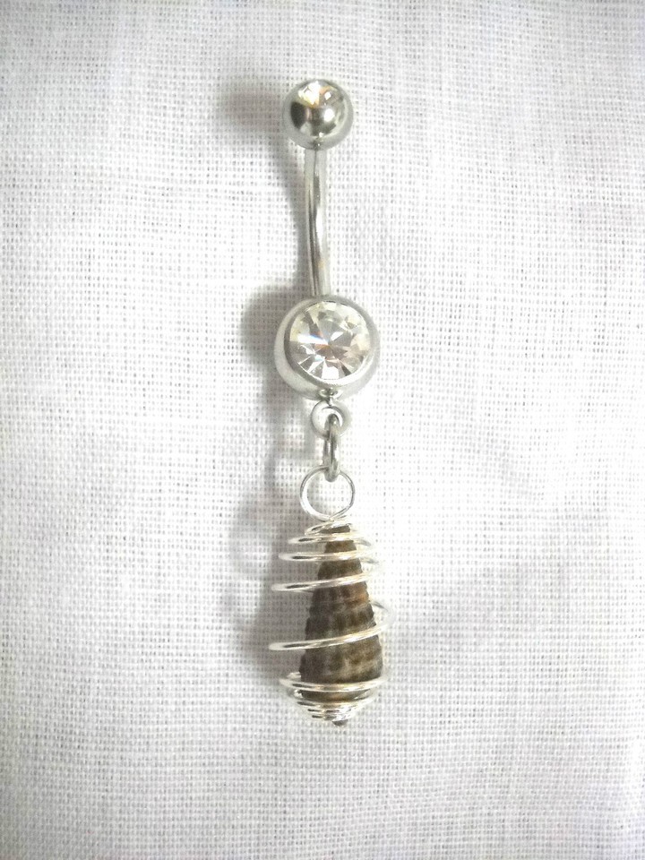 BEACH BUM WHOLE BROWN SPIRAL SEA SHELL WIRE WRAP 14g CLEAR CZ BELLY RING BARBELL