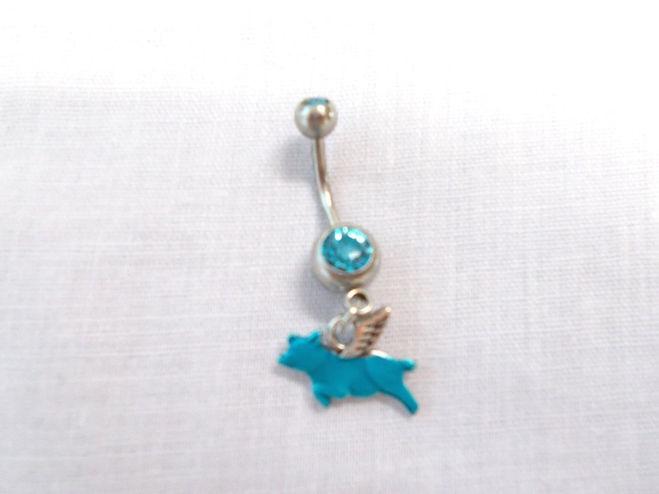 FLYING PIG w BLUE ENAMEL BODY & SILVER WINGS CHARM 14g TURQUOISE CZ BELLY RING