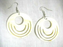 ELEGANT PEARLY WHITE with some natural CHAMPAGNE TAN COLORING ROUND with 3 CUT OUT DECO LINES REAL SHELL DANGLING EARRINGS