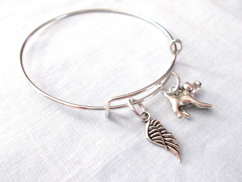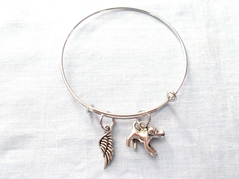 IN MEMORY OF ANGEL WING & 3D DOG (2) CHARMS ON SILVER ADJUSTABLE BANGLE BRACELET