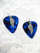 NEW PAIR OF EARRINGS - HEAVENLY THEME - DEEP COBALT BLUE CELLULOID GUITAR PICKS WITH AN ALLOY SILVER SHAPED ANGEL WING CHARM ON EACH