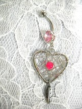 14 gauge surgical stainless steel navel ring with a LARGE HEART SHAPED DREAM CATCHER 1 DANGLING FEATHER with a HOT PINK ROUND BEAD IN THE CENTER A DAZZLING PINK CZ STONE IN THE BOTTOM OF THE BANANA BELLY BAR