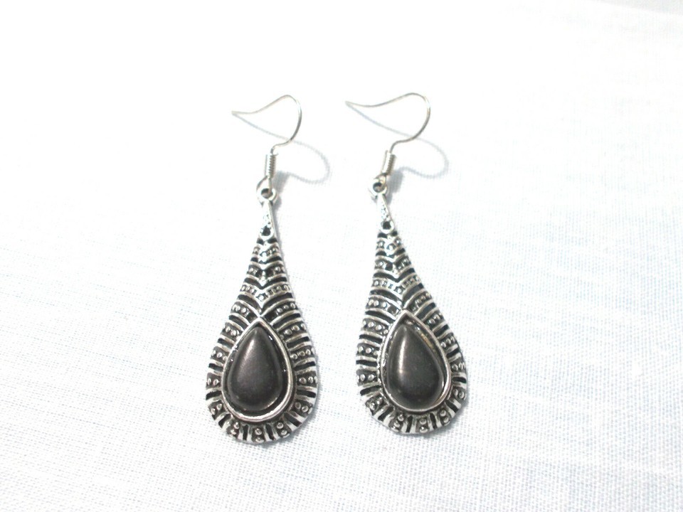 SLEEK BLACK TEARDROP HOWLITE GEM SHAPE DECO DESIGN ALLOY DANGLE EARRINGS