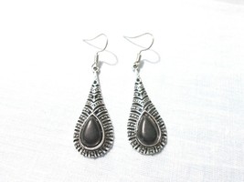 LONG SLEEK LINES TEARDROP / TEAR DROP SHAPE WITH A BLACK HOWLITE GEM AT THE BOTTOM DANGLE EARRINGS