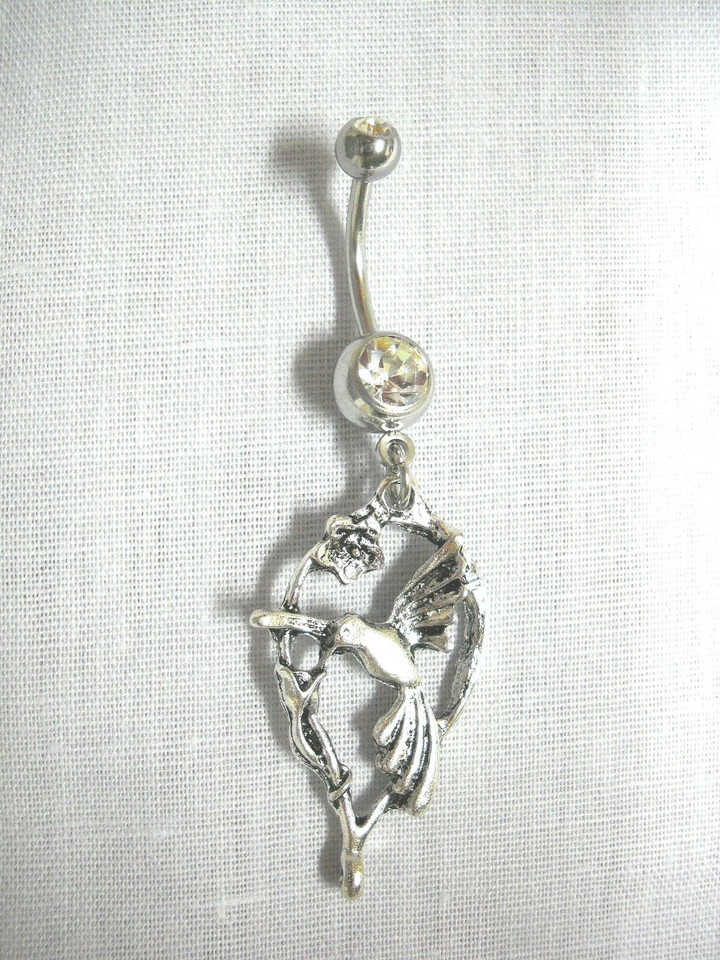 14 guage stainless steel curved navel ring belly bar WITH A PRETTY HUMMINGBIRD DROPLET FLOWER VINE SCENE CHARM on banana bar with DAZZLING DOUBLE CLEAR CZ STONE BELLY BAR