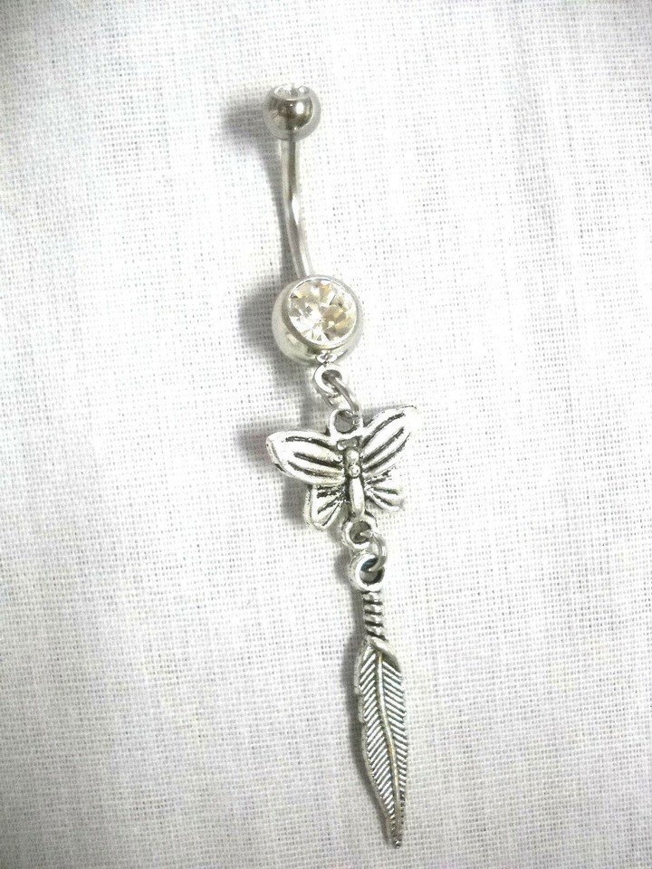 BUTTERFLY DREAM CATCHER 2 DANGLING CHARMS ON CLEAR 14g CZ BELLY RING BARBELL
