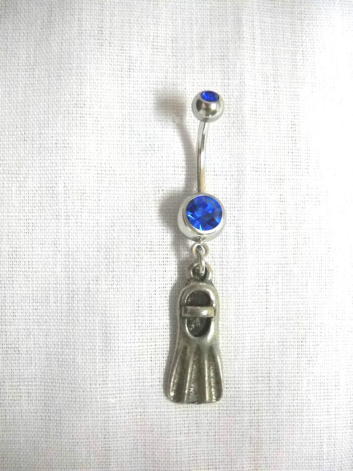 14 guage surgical stainless steel navel barbell with a PEWTER SNORKELING FLIPPER / SCUBA DIVER FLIPPER CHARM on a DOUBLE DAZZLING COBALT BLUE CZ banana bar