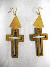 MEDIUM BROWN STAINED CROSS SILHOUETTE WITH GOLD TONE TRIANGLE ACCENTS DOUBLE DANGLE LIGHTWEIGHT BALSA WOOD EARRINGS