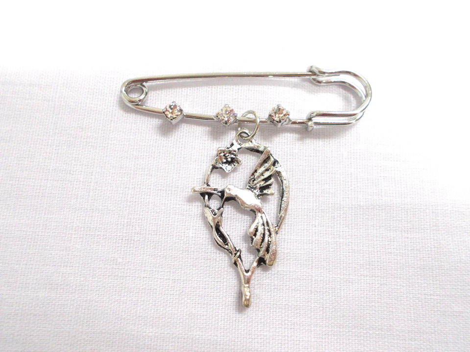 3 CLEAR CRYSTAL 2 INCH PIN WITH A GORGEOUS HUMMINGBIRD with FLOWERS DESIGN HOOP SILVER ALLOY PENDANT DANGLING