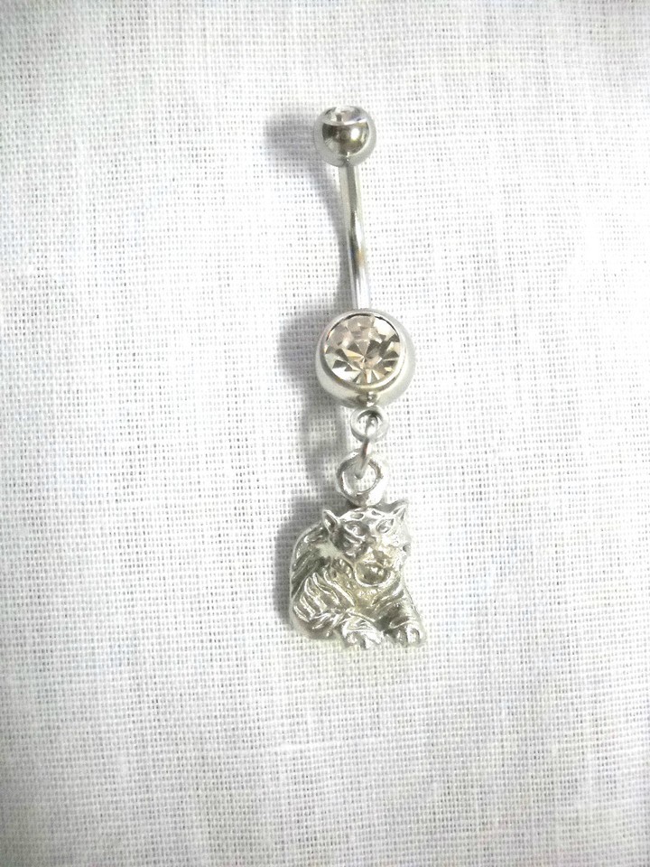 NEW BENGAL TIGER HUNTRESS CHARM 14g CLEAR CZ NAVEL BARBELL BELLY RING ANIMALS