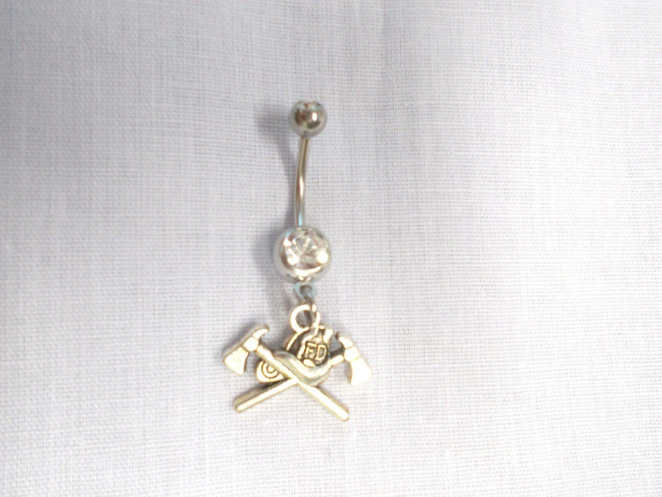 FIREMAN HAT & FIREFIGHTER AXE HALLIGAN TOOL 14g CLEAR CZ BELLY RING BARBELL