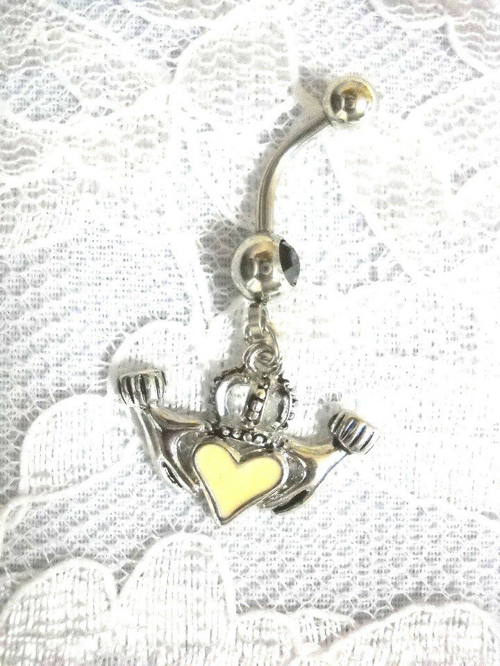 14 gauge surgical stainless steel navel ring bar with a DETAILED CELTIC CLADDAGH / FRIENDSHIP LOVE WITH CREAM COLOR INLAY CHARM with A CLEAR CZ STONE BANANA BAR (NOT SEEN IN PICTURE)