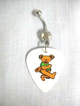 14 guage stainless steel navel ring belly bar with a WHITE GUITAR PICK ORANGE LIME GREEN DANCING BEAR (FRONT) ON A DOUBLE DAZZLING CLEAR CZ banana bar BACK SIDE HAS TEXT GRATEFUL DEAD (WHITE) OFFICIAL JIM DUNLOP MED GAUGE DEAD HEAD MERCHANDISE
