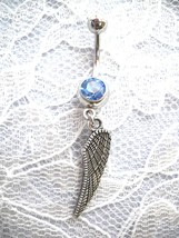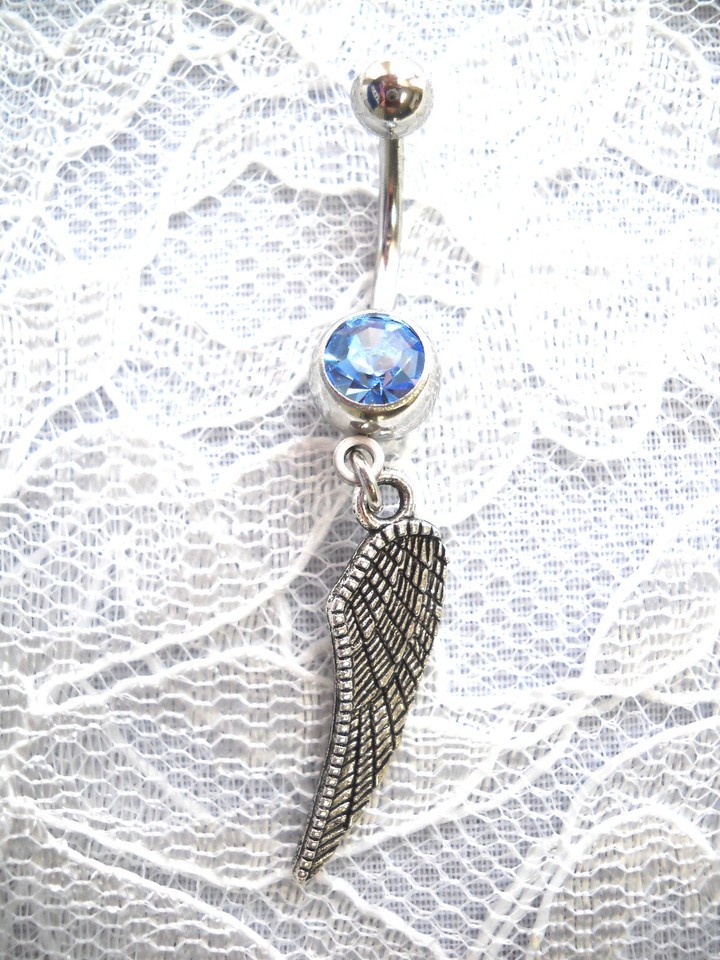 It is 14 guage - surgical stainless steel navel ring with A DOUBLE SIDED DETAILED FEATHERED ANGEL WING DANGLING CHARM ON A DAZZLING BABY BLUE CUBIC ZIRCONIA STONE ON THE BOTTOM END OF THE BANANA BAR