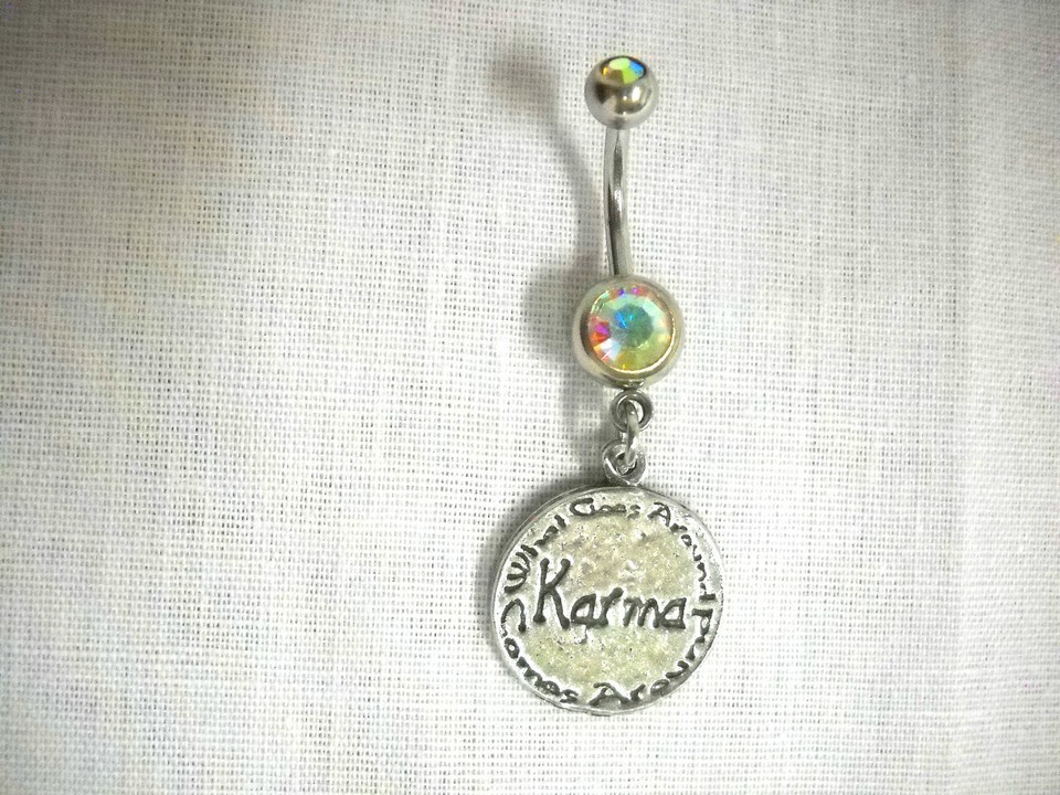 14 guage surgical stainless steel navel ring barbell with A ROUND CAST PEWTER TEXT - KARMA - WHAT GOES AROUND COMES AROUND CHARM ON A DOUBLE AURORA BOREALIS CZ STONE banana bar