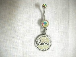 NEW TEXT ROUND DISC KARMA CHARM ON AURORA BOREALIS CZ BELLY RING NAVEL BARBELL