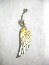 14 gauge surgical stainless steel navel ring belly barbell with NATURAL COLORS (some TAN / GRAY RAINBOW) ENGRAVED DETAIL MOTHER OF PEARL SHELL ANGEL WING DANGLING ON A DOUBLE CLEAR CZ STONE banana belly bar