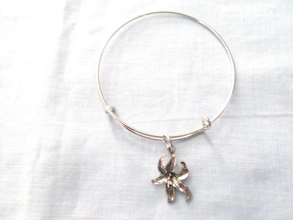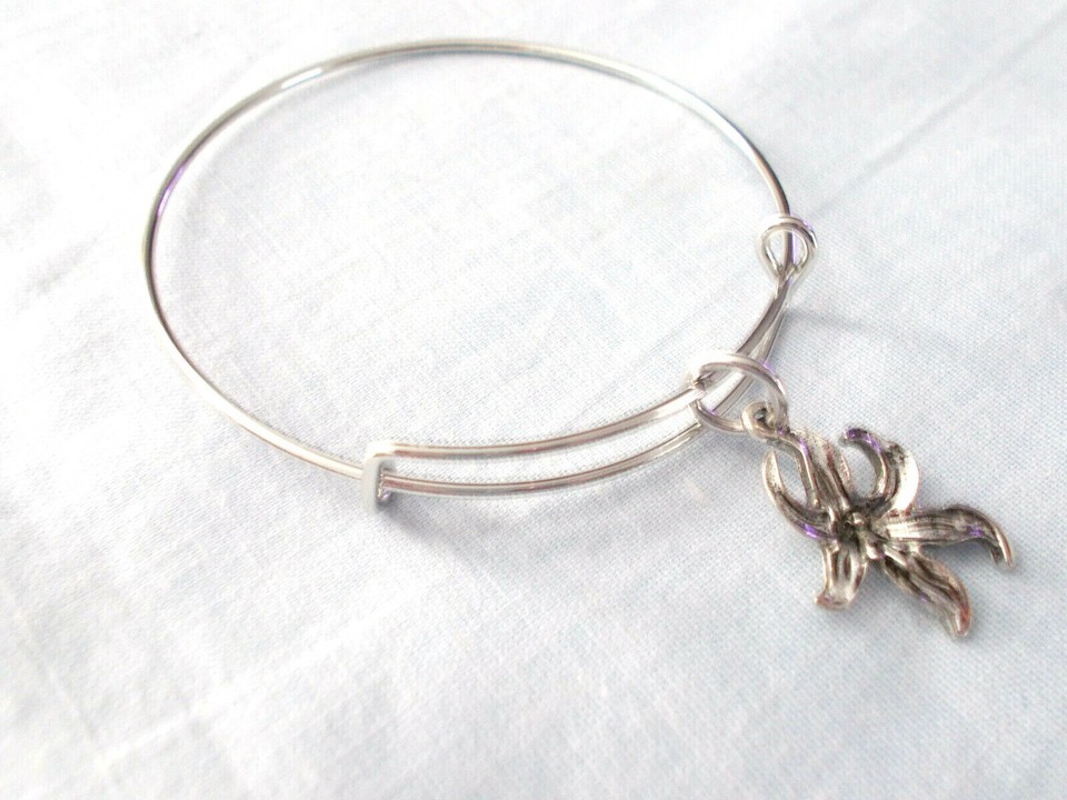 ELEGANT ORCHID OR TIGER LILY FLOWER CHARM ON SILVER ADJUSTABLE BANGLE BRACELET