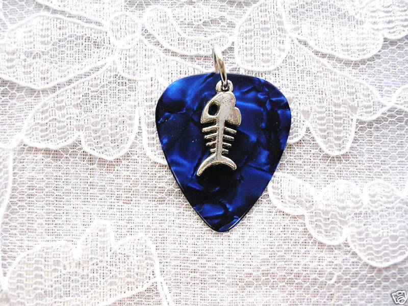 DARK BLUE GUITAR PICK PIRHANA FISH BONE CHARM PENDANT ADJ NECKLACE