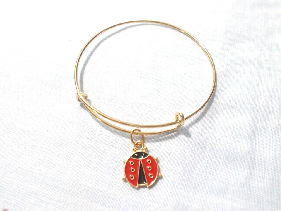 LADYBUG RED BLACK ENAMEL COLOR CHARM ON GOLDTONE ADJUSTABLE BANGLE BRACELET
