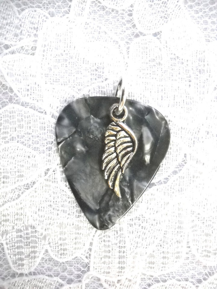 NEW - DARK CHARCOAL GRAY CELLULOID GUITAR PICK WITH A SILVER ALLOY CELTIC ANGEL WING CHARM PENDANT NECKLACE