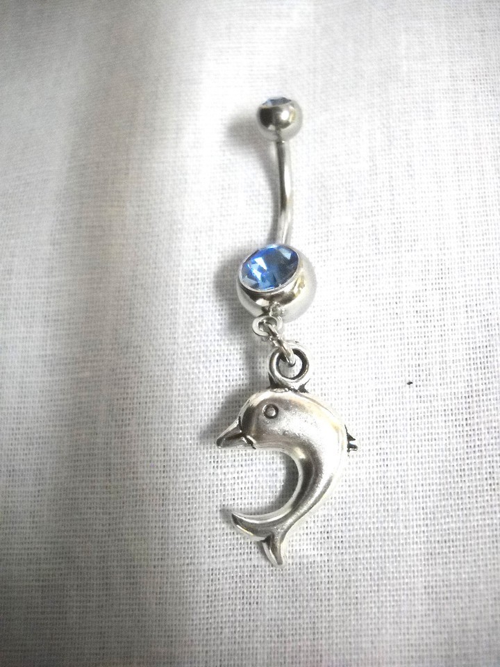 14 guage stainless steel curved navel bar with A SHINY SILVER ALLOY DOLPHIN DOUBLE SIDED DANGLING CHARM ON A DAZZLING DOUBLE BABY BLUE CZ BANANA BELLY BAR