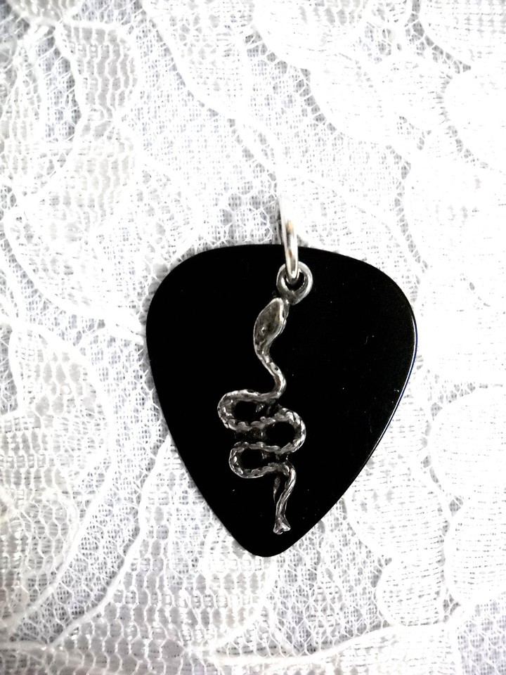 NEW SOLID BLACK GUITAR PICK w PEWTER SNAKE / SERPENT REPTILE CHARM PENDANT