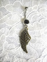 It is 14 guage - surgical stainless steel navel ring - WITH A ANTIQUED BRASS DETAILED ANGEL WING DANGLING CHARM on banana bar with DOUBLE BLACK CUBIC ZIRCONIA STONES AT BOTH ENDS