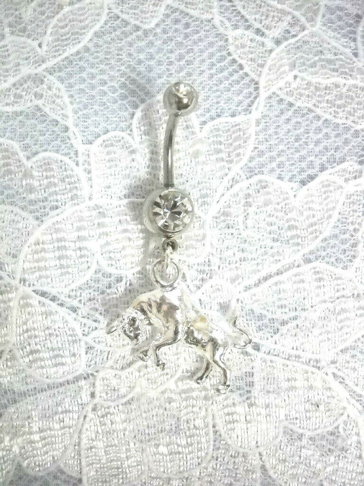 It is 14 gauge surgical stainless steel navel ring with A DETAILED WILDLIFE ANIMAL BULL - RUNNING OF THE BULLS - BULL RIDER CHARM DANGLING ON A DOUBLE CLEAR CZ STONE BANANA BAR